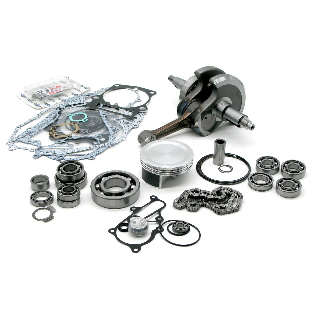 Includes- Crankshaft, Piston Kit, Complete Engine Gasket Kit, Oil Seal Kit, Main Bearing and Seal Kit, Water Pump Rebuild Kit, Transmission Bearing Kit, Countershaft Bushing/Seal Kit, Cam Chain and Counter Balancer Bearing Kit